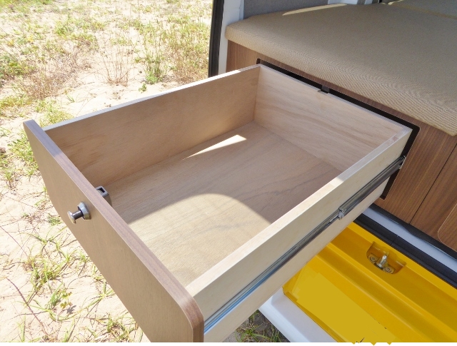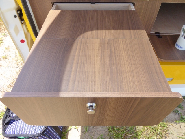 オプションのスライド収納ボックスと専用テーブルをセットすれば、あっという間に食事スペースが出来上がり。